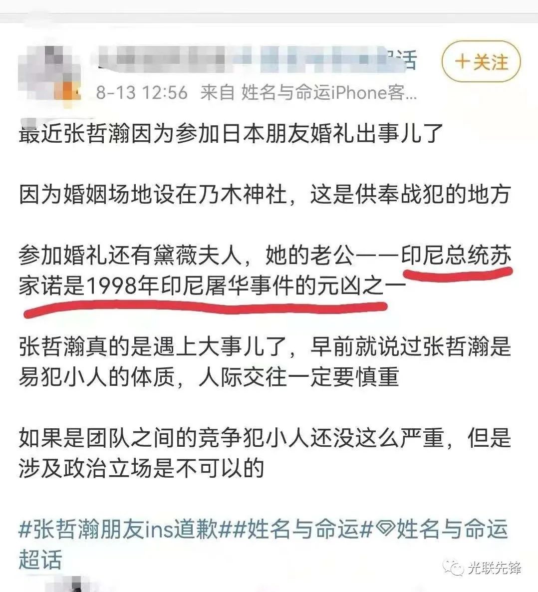 2021年8月12日,有网友扒出张哲瀚2019年曾经去日本参加了在日本的乃木神社举办的婚礼。不仅如此,在婚礼中还与主张分裂中国、否定南京大屠杀的印尼前“第一夫人”黛薇夫人合影。随后,张哲瀚还被曝2018年曾在日本靖国神社前合影。这就是“张哲瀚事件”的大致经过。